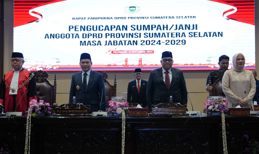 Rapat Paripurna Ke- I DPRD Prov. Sumsel dengan agenda dalam rangka pengucapan sumpah/janji Anggota DPRD Provinsi Sumatera Selatan Masa Jabatan 2024-2029 dipimpin oleh H.M. Giri Ramanda N Kiemas, SE, MM didampingi oleh Wakil Ketua DPRD Prov.Sumsel; Hj. Kartika Sandra Desi, SH, MM, dihadiri oleh Pj. Gubernur Sumsel; Elen Setiadi, SH, M.S.E, Sekretaris Daerah; Drs. H. Edward Chandra, MH dan Sekretaris DPRD Prov.Sumsel H. Aprizal, S.Ag, SE, M.Si para perwakilan Organisasi Perangkat Daerah (OPD) di lingkungan Pemerintah Provinsi Sumatera Selatan.