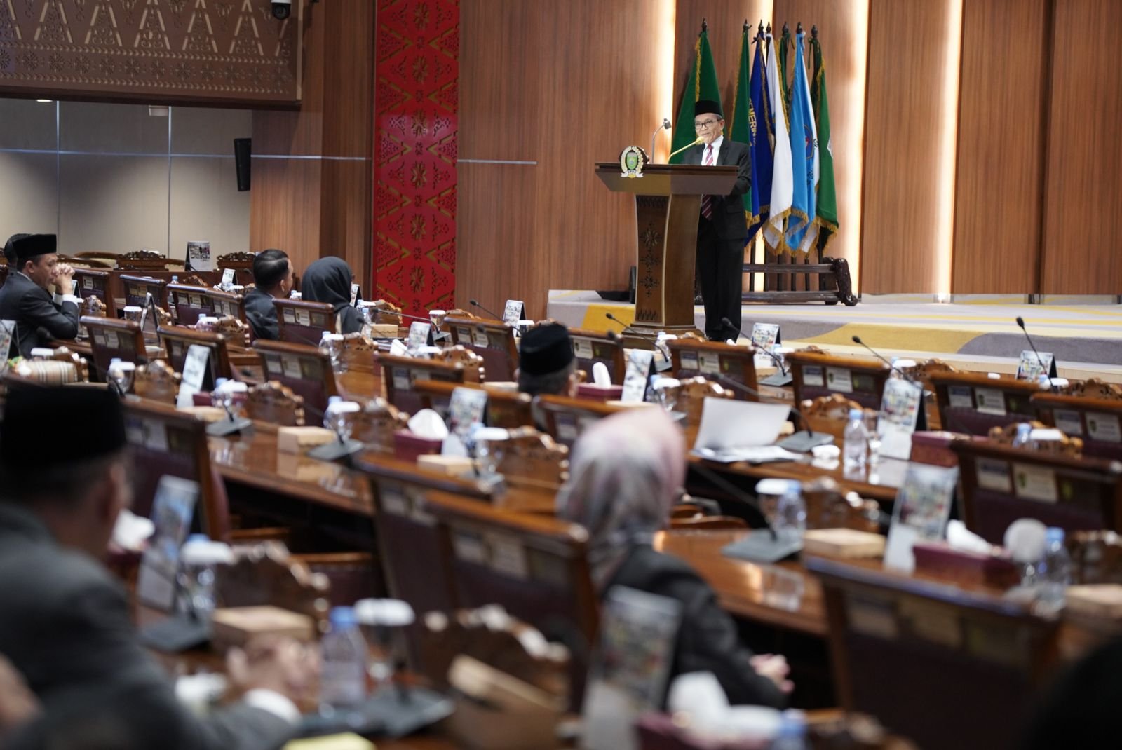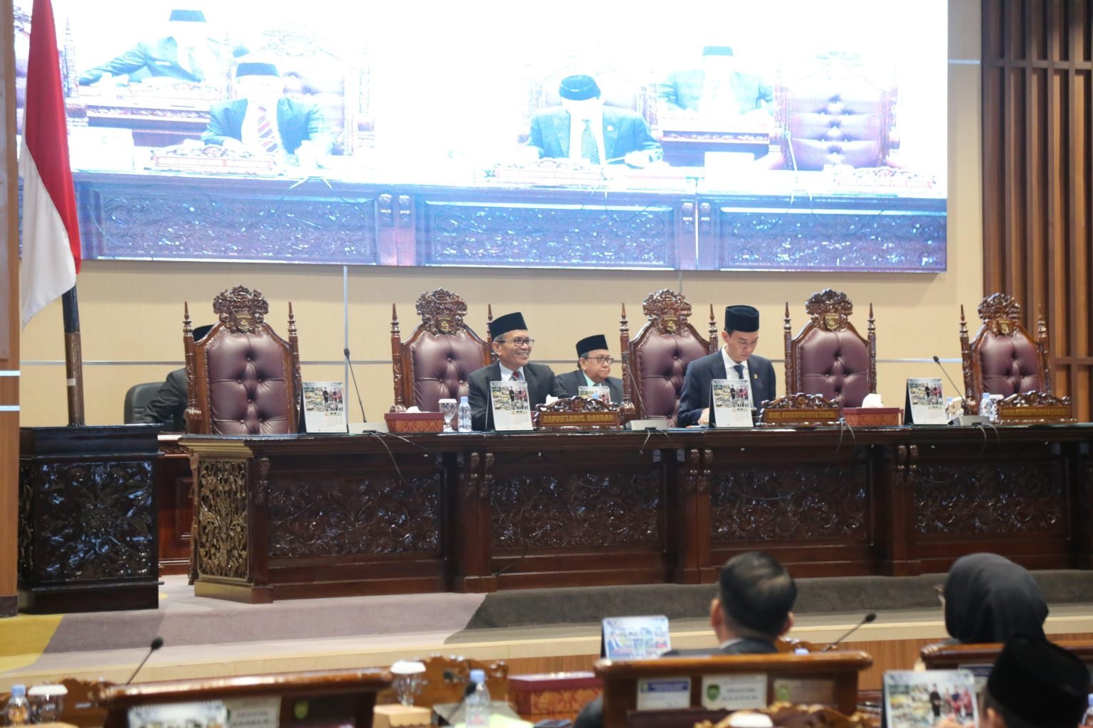 Rapat paripurna dipimpin Wakil Ketua DPRD Sumsel Muchendi Mahzareki, SE, M.Si. Pj. Gubernur Sumsel, diwakili oleh Sekretaris Daerah (Sekda) Ir. S.A. Supriono.