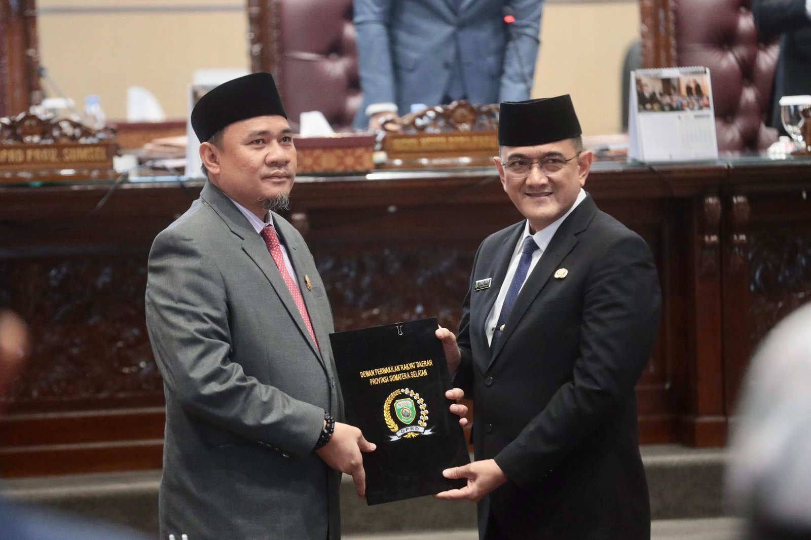 Pada kesempatan itu dilakukan penandatanganan keputusan DPRD Sumsel oleh Ketua DPRD Provinsi Sumsel Andie Dinialdie didampingi Sekda Sumsel Edward Candra (ADV)