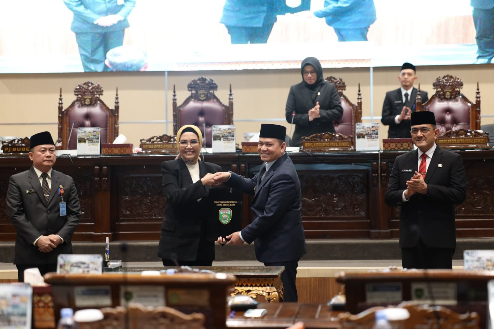 Rapat Paripurna Dipimpin oleh Ketua DPRD Sumsel; Hj. RA, Anita Noeringhati, SH, MH, didampingi oleh Para Wakil Hj. Kartika Sandra Desi, SH, MM dihadiri oleh Pj. Gubernur Sumsel; Pj. Gubernur Sumsel, Elen Setiadi, SH, M.S.E, Sekretaris Daerah; Drs. H. Edward Chandra, MH, Para Perwakilan OPD serta tamu undangan lain.