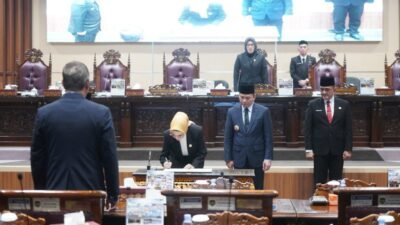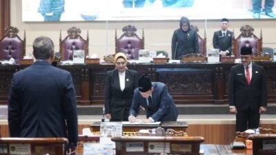 Selanjutnya dilakukan prosesi penandatanganan keputusan bersama antara eksekutif dan legislatif terhadap Raperda Perubahan APBD TA 2024 (ADV)
