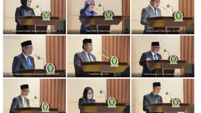 Sedangkan Fraksi PKS disampaikan oleh Firdaus, SH, Fraksi, Fraksi PAN Nyimas Sarah Halim, dan diakhiri penyampaian Fraksi Hanura Perindo oleh Pipa Sardi, SE.