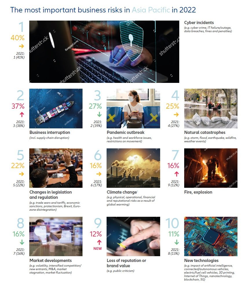 Insiden siber menduduki puncak Barometer Risiko Allianz hanya untuk kedua kalinya dalam sejarah survei (44% tanggapan), Gangguan bisnis turun ke urutan kedua (42%) dan Bencana alam menempati urutan ketiga (25%), naik dari keenam pada tahun 2021.