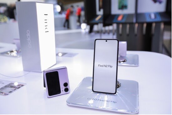 OPPO Find N2 Flip, yang menetapkan tolok ukur baru untuk ponsel flip, bersinar di MWC 2023, menyoroti komitmen OPPO untuk meningkatkan pasar smartphone lipat.