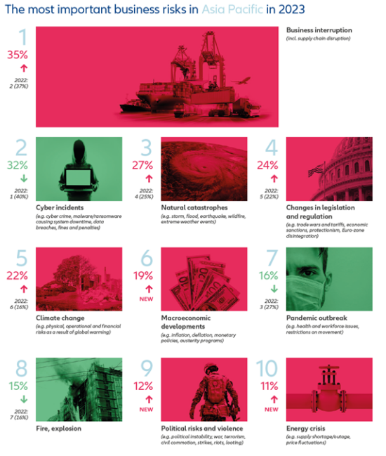 Business Interruption (#1 dengan 35% tanggapan) adalah risiko teratas di Asia Pasifik, melampaui Cyber Incidents (#2 dengan 32%) yang menempati peringkat teratas selama tiga tahun sebelumnya. Bencana Alam (#3 dengan 27%), Perubahan undang-undang dan peraturan (#4 dengan 24%), dan Perubahan Iklim (#5 dengan 22%) merupakan risiko utama lainnya di kawasan ini.