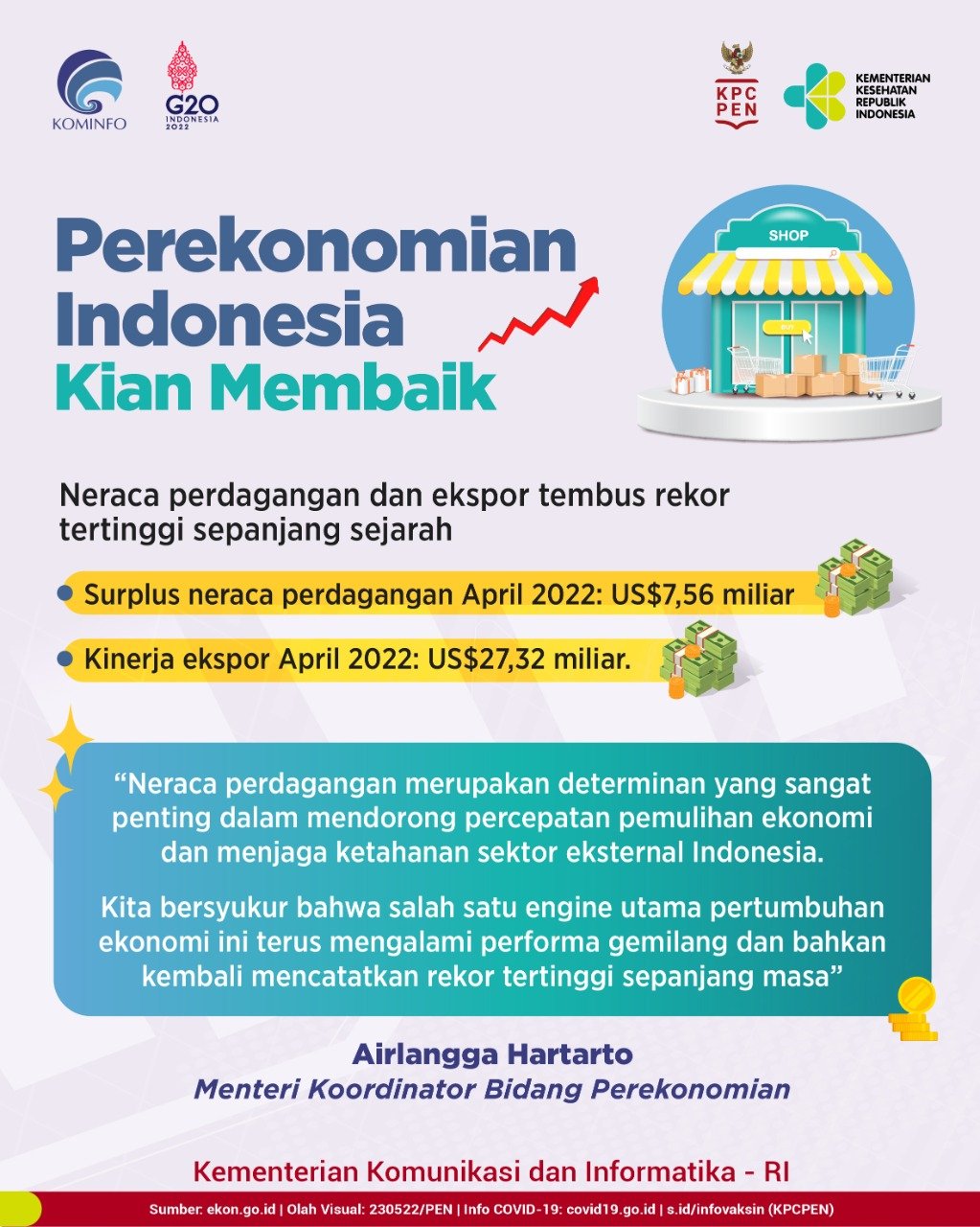 Surplus neraca perdagangan pada April 2022 mencapai US$7,56 miliar dengan kinerja ekspor di bulan yang sama mencapai US$27,32 miliar. Pencapaian tersebut kian membawa perekonomian Indonesia menjadi lebih tangguh mengingat neraca perdagangan merupakan salah satu indikator utama dalam meningkatkan cadangan devisa dan menjaga ketahanan sektor eksternal Indonesia.