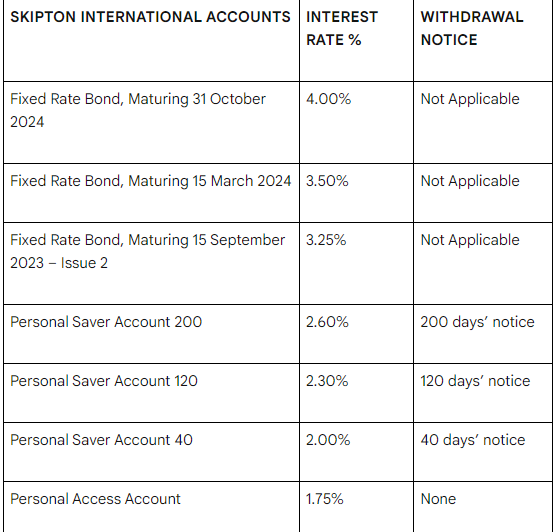Akun Akses Pribadi Skipton International (Skipton) memungkinkan penarikan dana tanpa pemberitahuan, sedangkan Variabel berarti suku bunga dapat berubah. Akun Pemberitahuan Tetap saat ini tetap ada, dengan pembayaran tertinggi dengan tarif kompetitif sebesar 4,00% tarif setara tahunan (jatuh tempo pada 31 Oktober 2024).