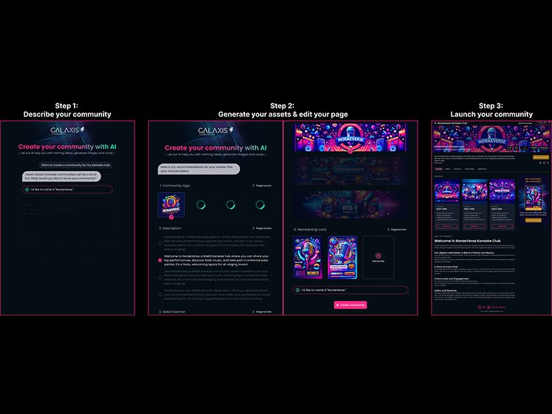 The suite introduced by Galaxis in the upcoming period revolutionizes the community creation process. This includes the Galaxis Assistant, a tool that aids creators during the ideation and generation process, offering insights and suggestions to enhance projects and make creativity more accessible and efficient.