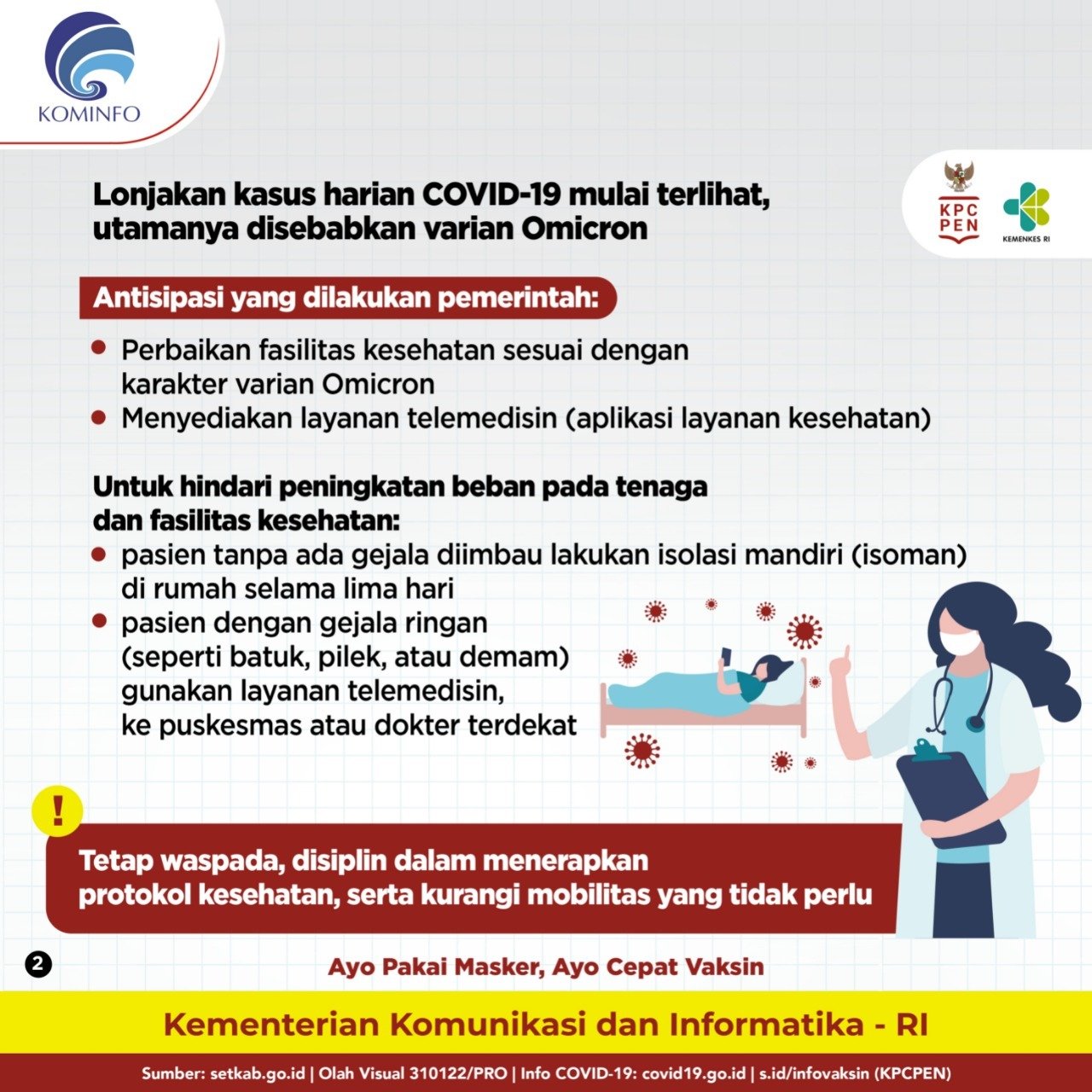 Untuk menghindari peningkatan beban pada tenaga dan fasilitas kesehatan, pemerintah mengimbau agar pasien tanpa ada gejala (asimtomatik) dapat melakukan isolasi mandiri (isoman) di rumah selama lima hari, sedangkan untuk pasien dengan gejala ringan (seperti batuk, pilek, atau demam) dapat menggunakan layanan telemedisin, ke puskesmas atau dokter terdekat.