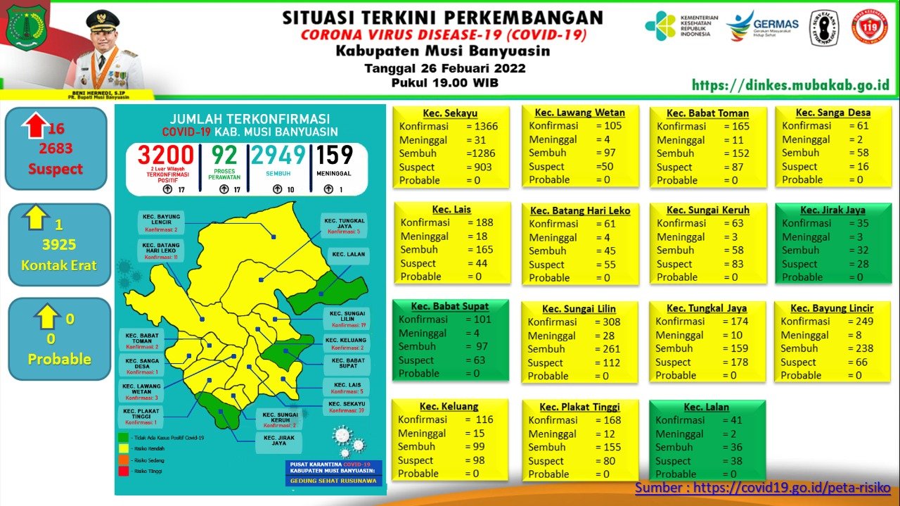 Povi merinci, adapun penambahan kasus positif diantaranya kasus 3184 perempuan usia 21 tahun Babat Toman, kasus 3185 Laki-laki 55 tahun Sekayu, kasus 3186 Laki-laki 39 tahun Lais, kasus 3187 perempuan 38 tahun Tungkal Jaya, kasus 3188 Laki-laki 44 tahun Sekayu, kasus 3189 perempuan 21 tahun Tungkal Jaya, kasus 3190 perempuan 21 tahun Sungai Lilin, kasus 3191 perempuan 27 tahun Sungai Lilin, kasus 3192 perempuan 31 tahun Tungkal Jaya.