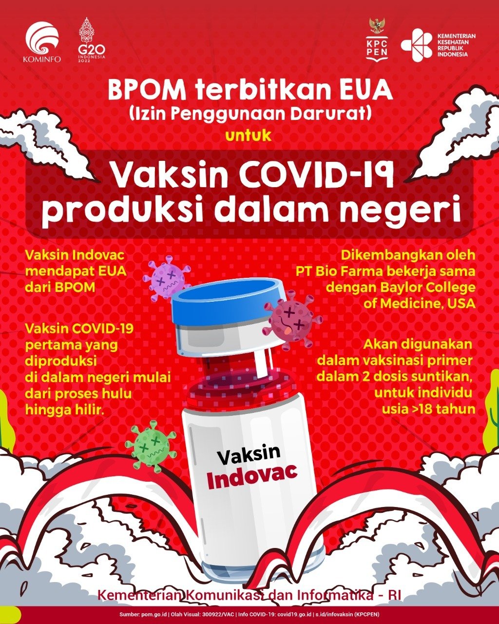 Pingintau.id, Jakarta – Pada 24 September 2022, BPOM telah menerbitkan EUA untuk vaksin COVID-19 pertama yang diproduksi di dalam negeri mulai dari proses hulu hingga hilir, yaitu Vaksin Indovac.