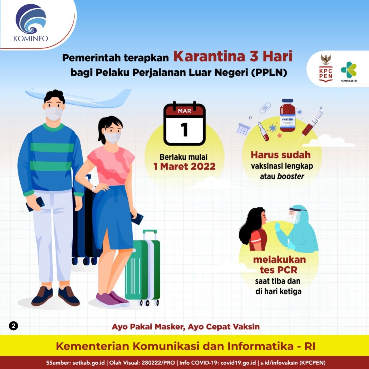 Ketentuan ini berlaku mulai 1 Maret 2022 untuk PPLN yang sudah vaksinasi lengkap atau mendapatkan booster, dan melakukan tes PCR saat tiba dan di hari ketiga.