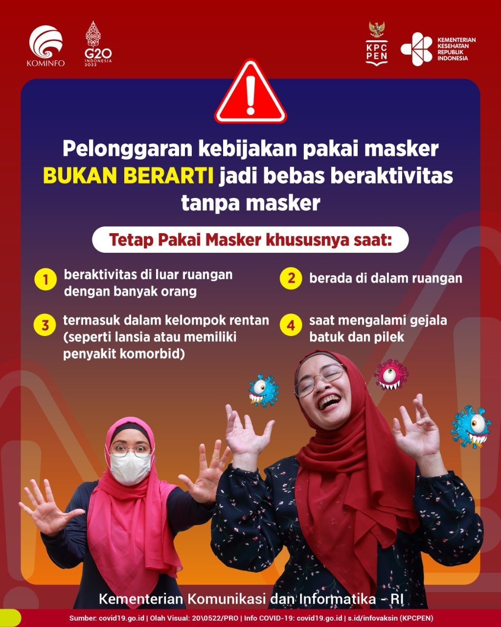 Pingintau.id -Pelonggaran kebijakan pakai masker bukan berarti jadi bebas beraktivitas tanpa masker. Baiknya kita tetap Pakai Masker, khususnya saat: