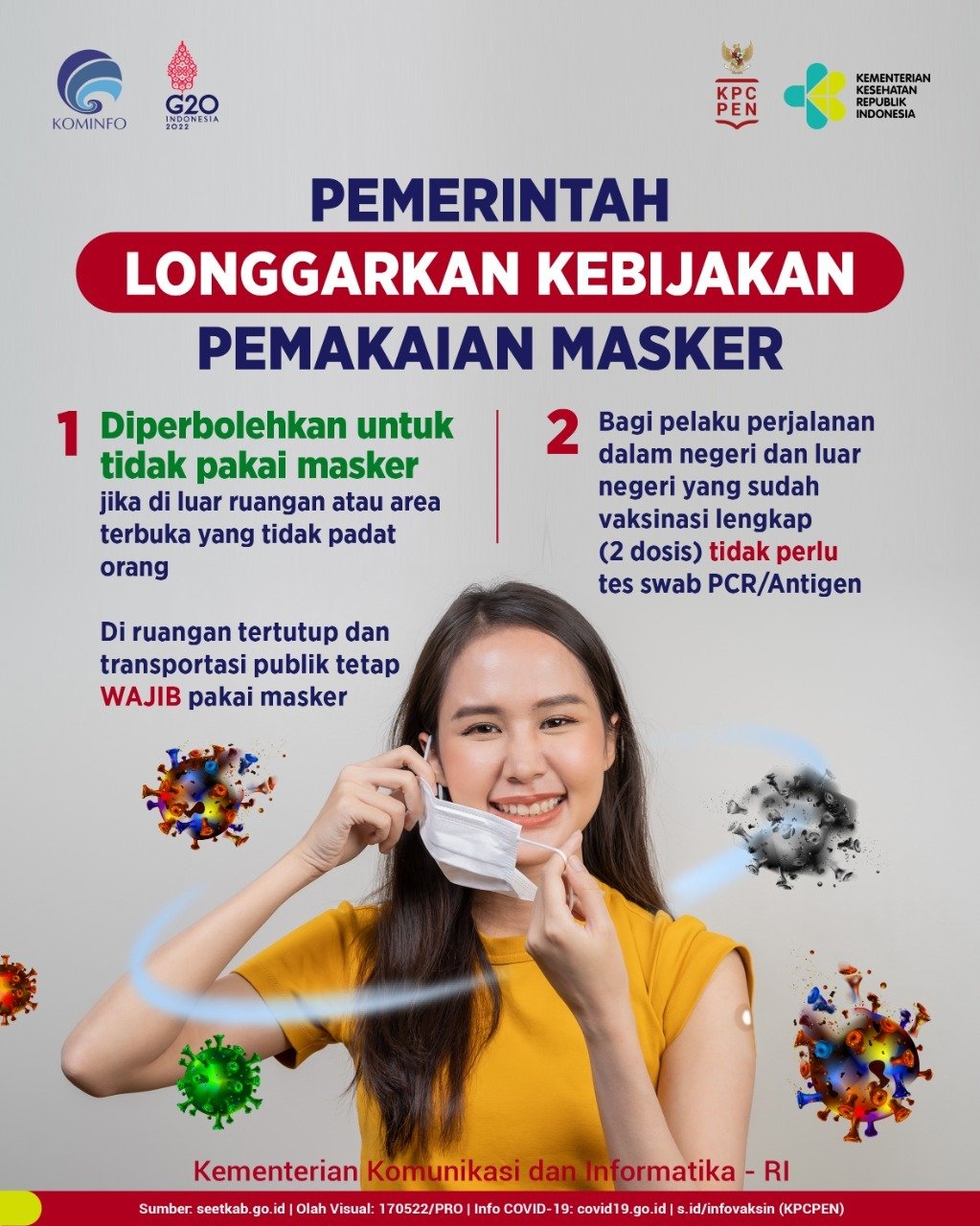 Pingintau.id -Pemerintah memutuskan untuk melonggarkan kebijakan pemakaian masker, yaitu :