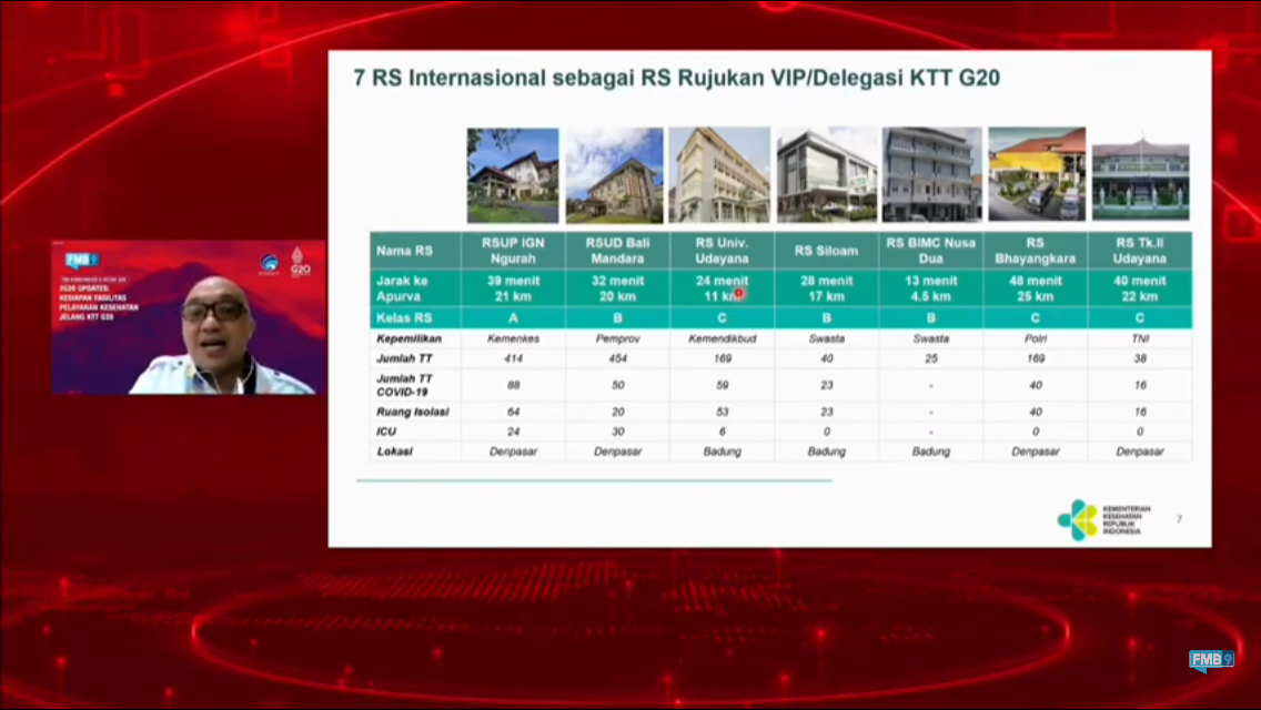 Direktur Tata Kelola Pelayanan Kesehatan Kemenkes Sunarto pada konferensi pers virtual Kamis (22/9/2022) mengatakan ketujuh RS rujukan tersebut termasuk untuk Presidensi maupun Delegasi.