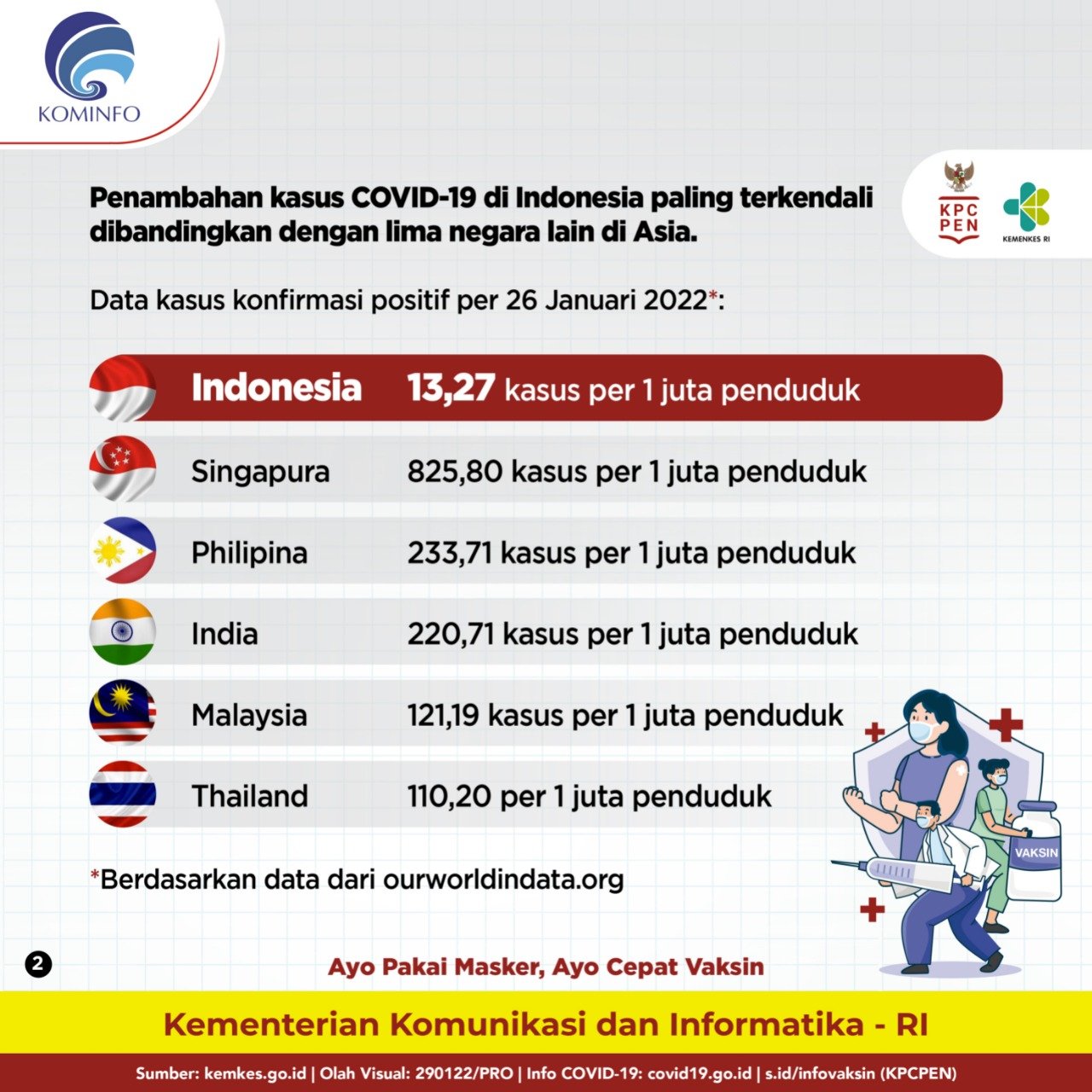 Situs ourworldindata.org merilis data kasus konfirmasi positif per 26 Januari 2022 yang menunjukkan Indonesia memiliki 13,27 kasus per 1 juta penduduk, jumlah yang jauh lebih kecil jika dibandingkan dengan Singapura dengan 825,80 kasus per 1 juta penduduk, Filipina dengan 233,71 kasus per 1 juta penduduk, atau dengan India: 220,71 kasus per 1 juta penduduk, Malaysia dengan 121,19 kasus per 1 juta penduduk, serta Thailand: 110,20 kasus per 1 juta penduduk.