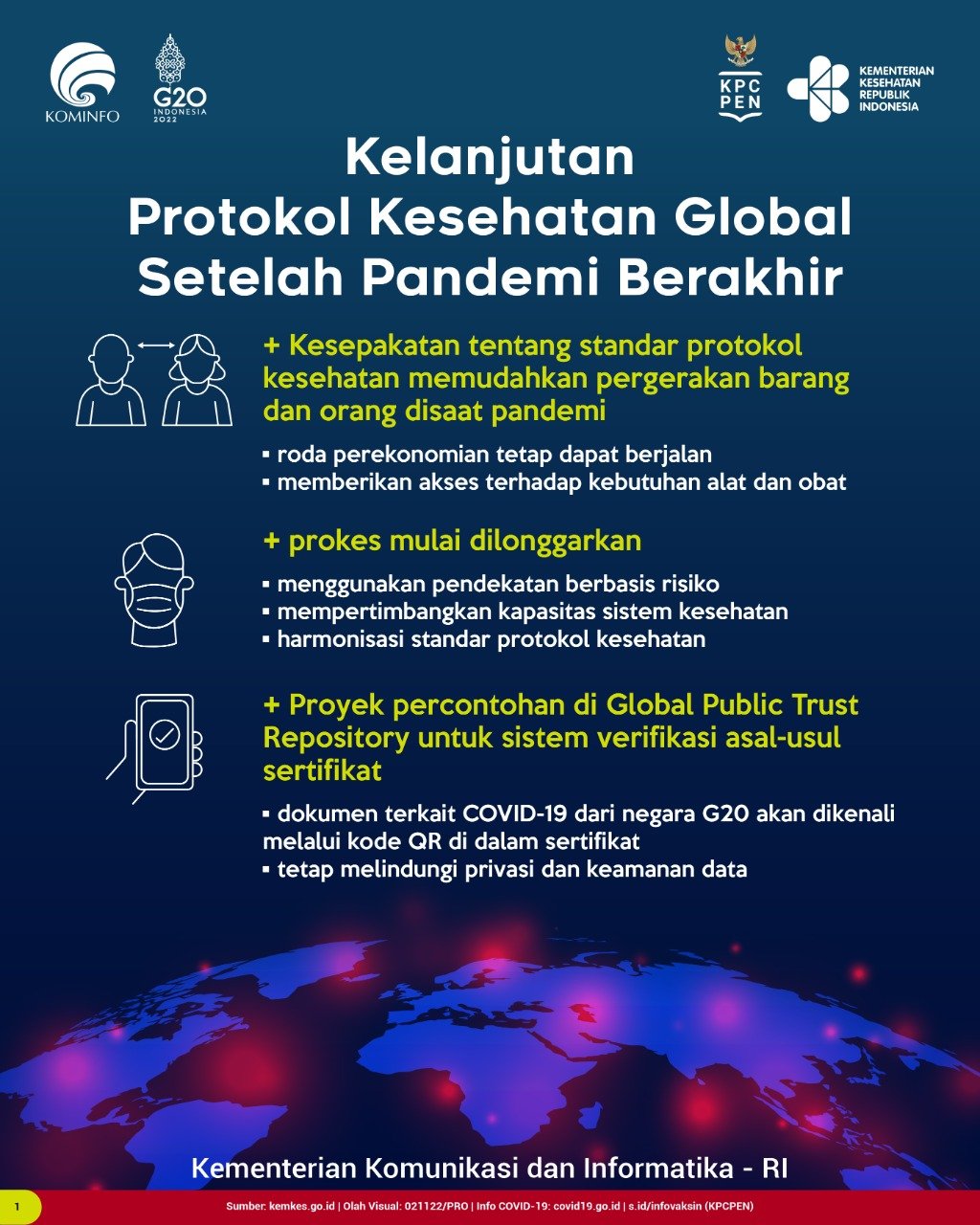Di sisi lain, ada juga proyek percontohan di Global Public Trust Repository untuk sistem verifikasi asal-usul sertifikat. Dalam proyek ini dokumen terkait COVID-19 dari negara G20 akan dikenali melalui kode QR di dalam sertifikat, tentu dengan tetap melindungi privasi dan keamanan data.