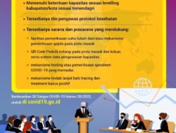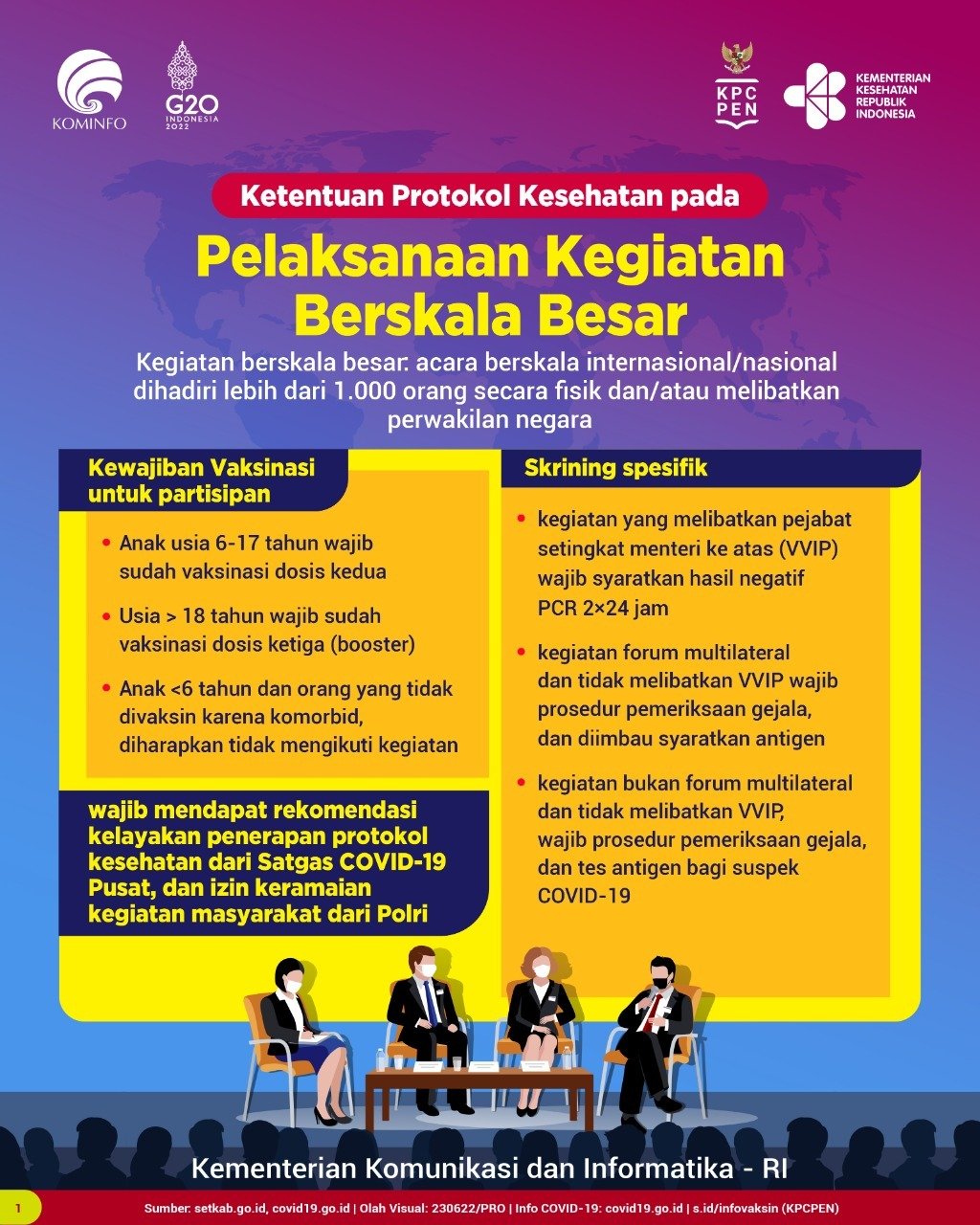 Pingintau.id, Satgas Penanganan COVID-19 mengeluarkan SE Nomor 20/2022 yang mengatur tentang protokol kesehatan untuk kegiatan domestik/internasional berskala besar dengan peserta 1.000 orang atau lebih yang hadir secara fisik, atau ketika melibatkan perwakilan negara.