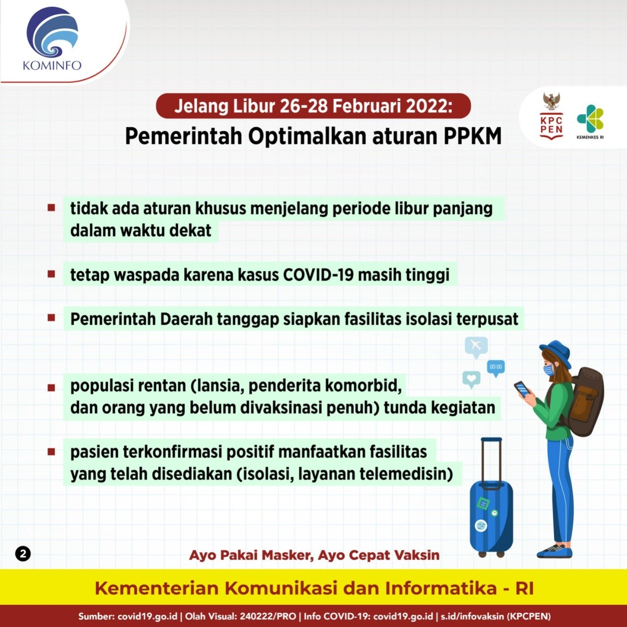 Pingintau.id, Menjelang libur panjang dari 26-28 Februari 2022, pemerintah tidak membuatkan aturan khusus, namun meminta pemerintah daerah untuk tanggap dalam menyiapkan fasilitas isolasi terpusat.
