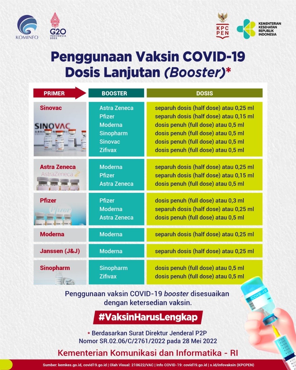 Pingintau.id, Terdapat penambahan regimen dosis lanjutan (booster) untuk vaksin primer Sinovac dan Sinopharm, hal ini berdasarkan Surat Direktur Jenderal P2P Nomor SR.02.06/C/2761/2022 pada 28 Mei 2022.