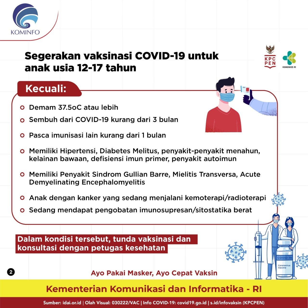 Pingintau.id, Segerakan vaksinasi COVID-19 untuk anak usia 12-17 tahun, kecuali jika anak dalam kondisi demam (37.5 derajat Celsius atau lebih), baru sembuh dari COVID-19 kurang dari 3 bulan, dan berada dalam kondisi kurang dari 1 bulan setelah imunisasi lain.