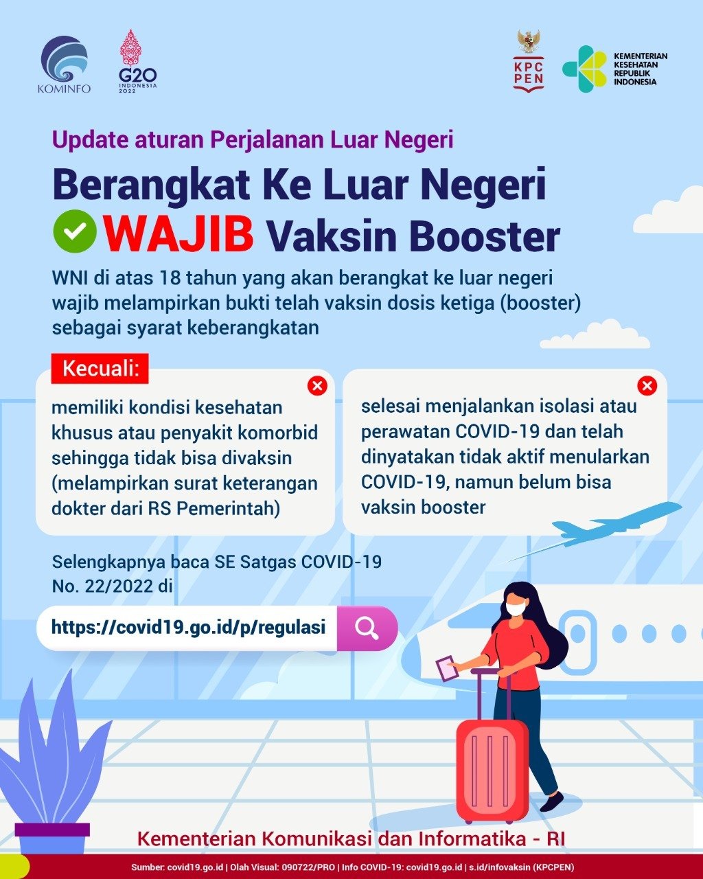 Pingintau.id, Berdasarkan SE Satgas Penanganan COVID-19 No. 22/2022, WNI berusia di atas 18 tahun yang akan berangkat ke luar negeri wajib melampirkan bukti telah vaksin dosis ketiga (booster) sebagai syarat keberangkatan.