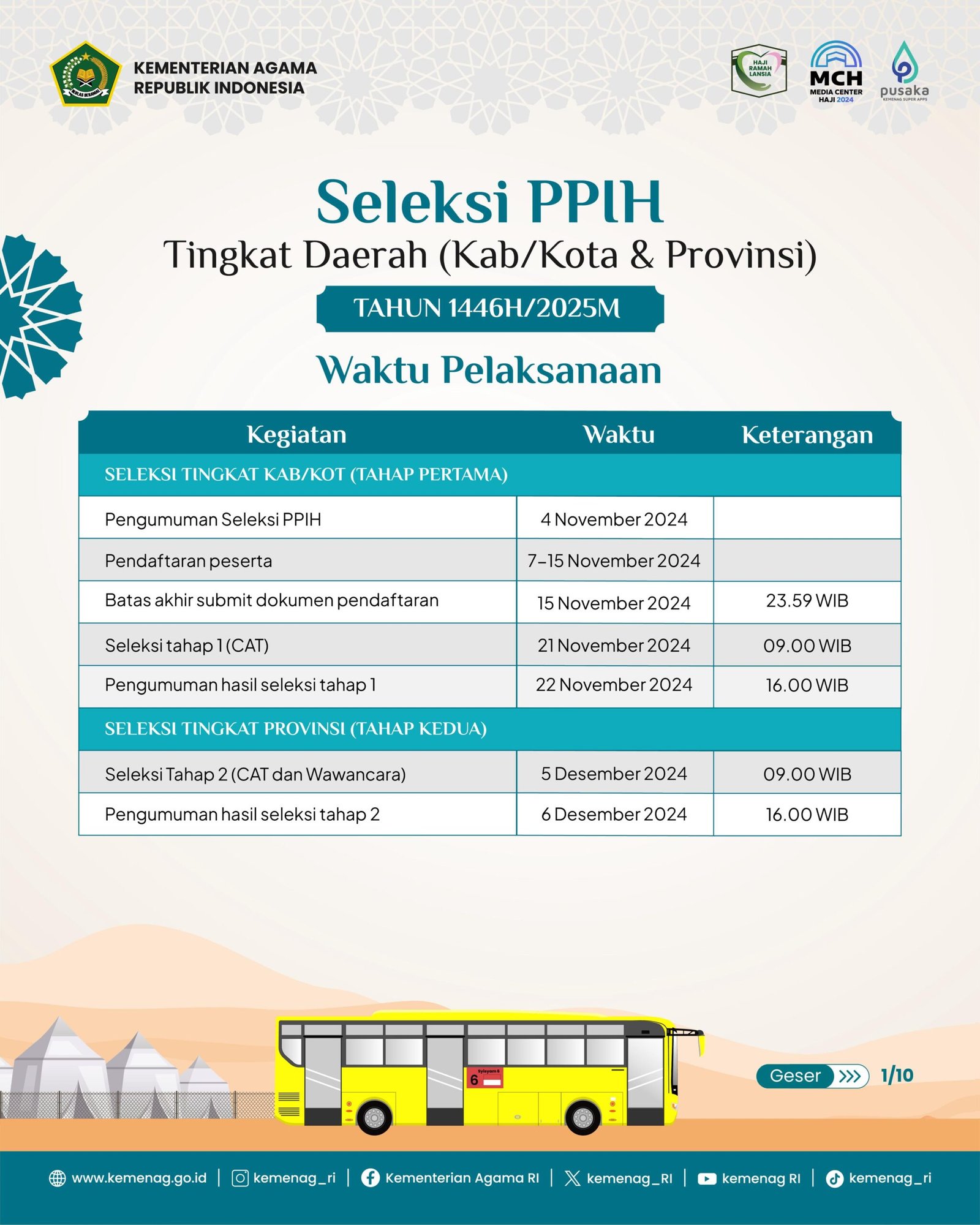 “Ini baru tingkat daerah. Untuk pendaftaran seleksi petugas haji 1446 H/2025 M tingkat pusat akan diumumkan kemudian,” sambungnya.