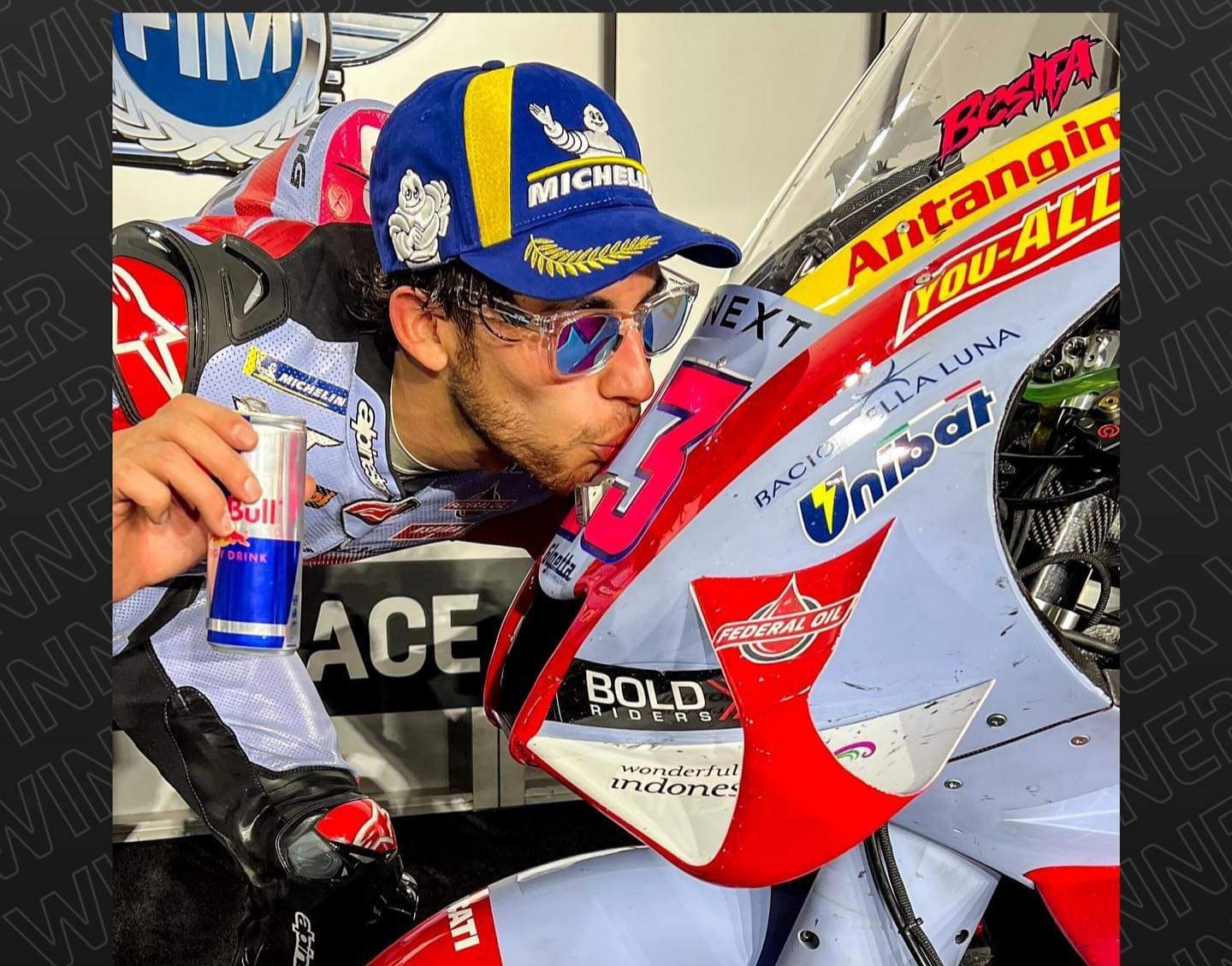 Gegap gempita tak hanya dirasakan oleh seluruh kru di garasi tim asal Italia itu. Perasaan serupa ikut dirasakan oleh bangsa Indonesia lantaran turut menikmati kemenangan perdana pebalap kelahiran Torino, 14 Januari 1997 tersebut. Bukan tanpa sebab, karena Bastianini dan rekan setimnya Fabio Di Giannantonio ikut menggendong sejumlah brand produk asli buatan Indonesia.