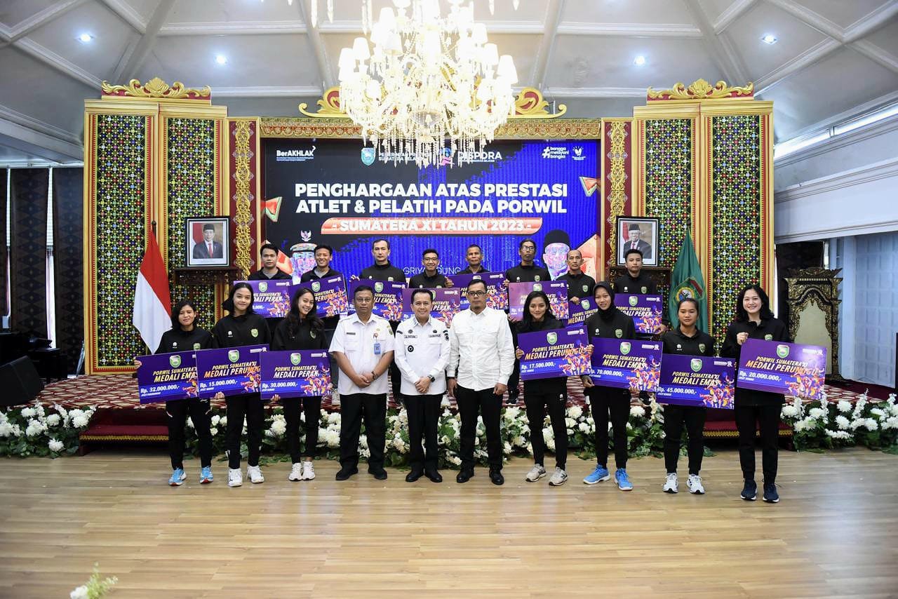 Bonus tersebut diberikan sebagai bentuk apresiasi bagi mereka yang berhasil meraih medali di Porwil Sumatera XI Tahun 2023 di Griya Agung, Palembang, Sumatera Selatan, Rabu (27/3/2024).