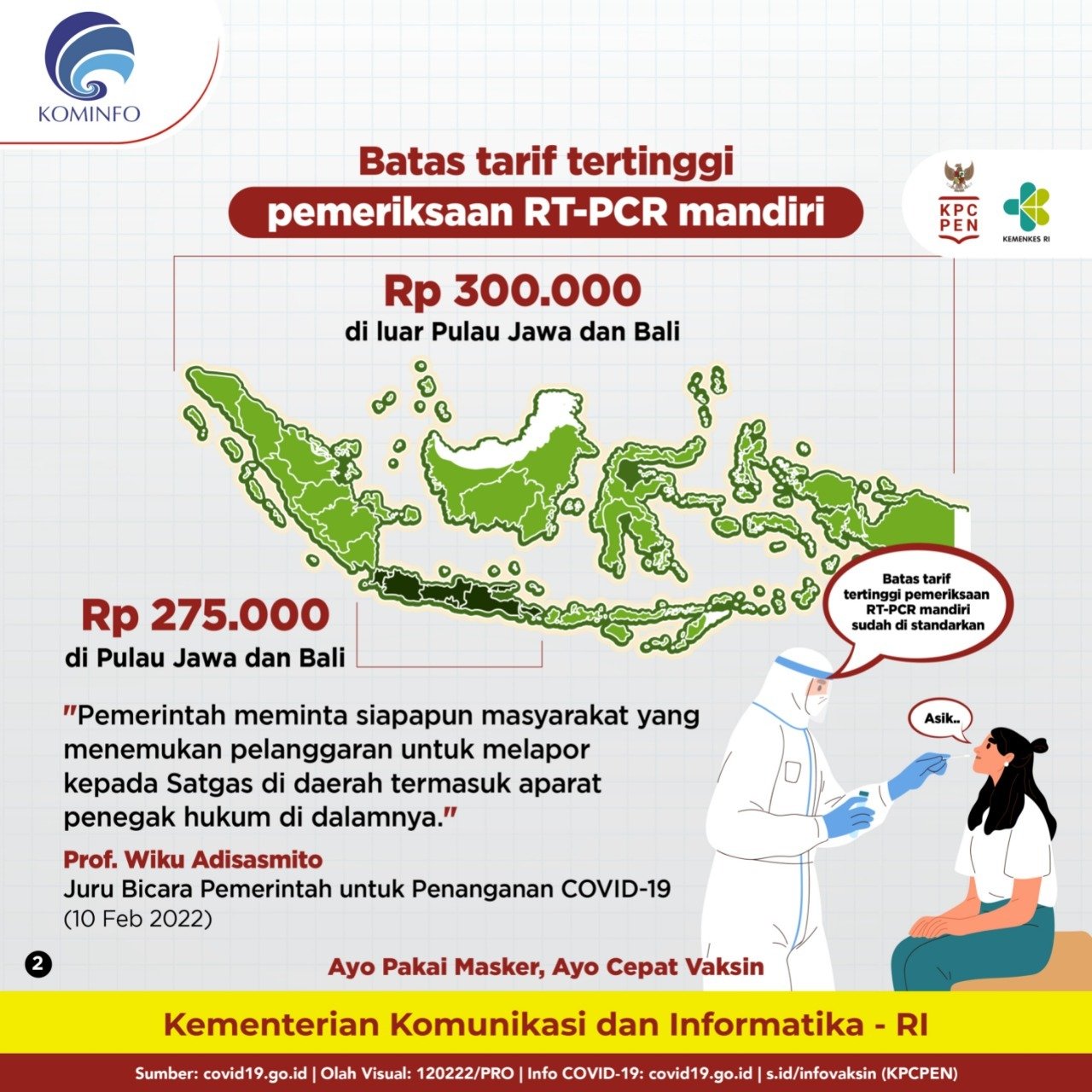 Dalam ketentuan tersebut Biaya pemeriksaan RT-PCR mandiri di Pulau Jawa dan Bali ditetapkan sebesar Rp 275.000 dan di luar Pulau Jawa dan Bali sebesar Rp 300.000.