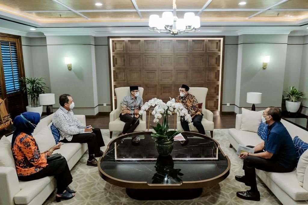 Menparekraf Sandiaga Uno saat menerima kunjungan Wakil Gubernur Jawa Tengah, Taj Yasin Maimoen, di kantor Kemenparekraf/Baparekraf, Gedung Sapta Pesona, Kamis (16/12/2021), mengatakan, pihaknya siap berkolaborasi dengan Pemerintah Provinsi Jawa Tengah dengan menghadirkan lebih banyak program pelatihan dan pendampingan serta program-program lain yang tepat sasaran, tepat manfaat, dan tepat waktu.