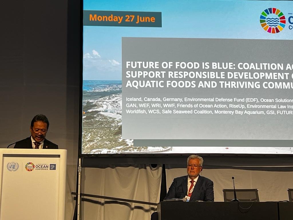 Hal ini disampaikan Menteri Trenggono saat mengisi acara Blue Food Coalition yang menjadi rangkaian kegiatan United Nation Oceans Conference (UNOC) 2022 yang berlangsung di Lisbon, Portugal, Senin (27/6/2022) siang waktu setempat. Acara Blue Food Coalition membahas tentang ketahanan pangan melalui produk akuatik.
