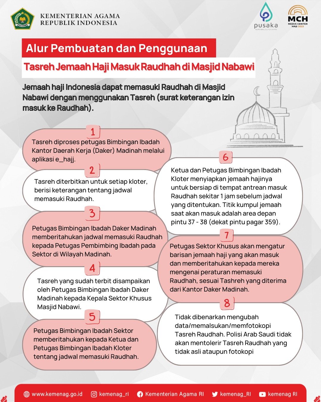 “Setelah mendapat informasi dari Daker Madinah, Petugas Bimbingan Ibadah Sektor memberitahukan kepada Ketua dan Petugas Bimbingan Ibadah Kloter tentang jadwal memasuki Raudhah,” sambungnya.