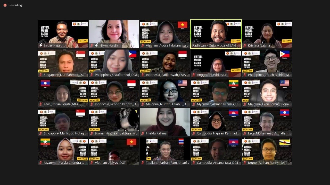 Pingintau.id, Pertemuan “ASEAN Virtual Model for Youth” yang diprakarsai oleh Duta Muda ASEAN Indonesia dan Direktorat Jenderal Kerja Sama ASEAN, Kementerian Luar Negeri, telah berlangsung 4-5 Desember 2021. Acara virtual yang dihadiri perwakilan pemuda dari berbagai bidang pendidikan dan profesi tersebut berlangsung secara meriah dan menghasilkan rasa antusiasme yang besar dari semua peserta.