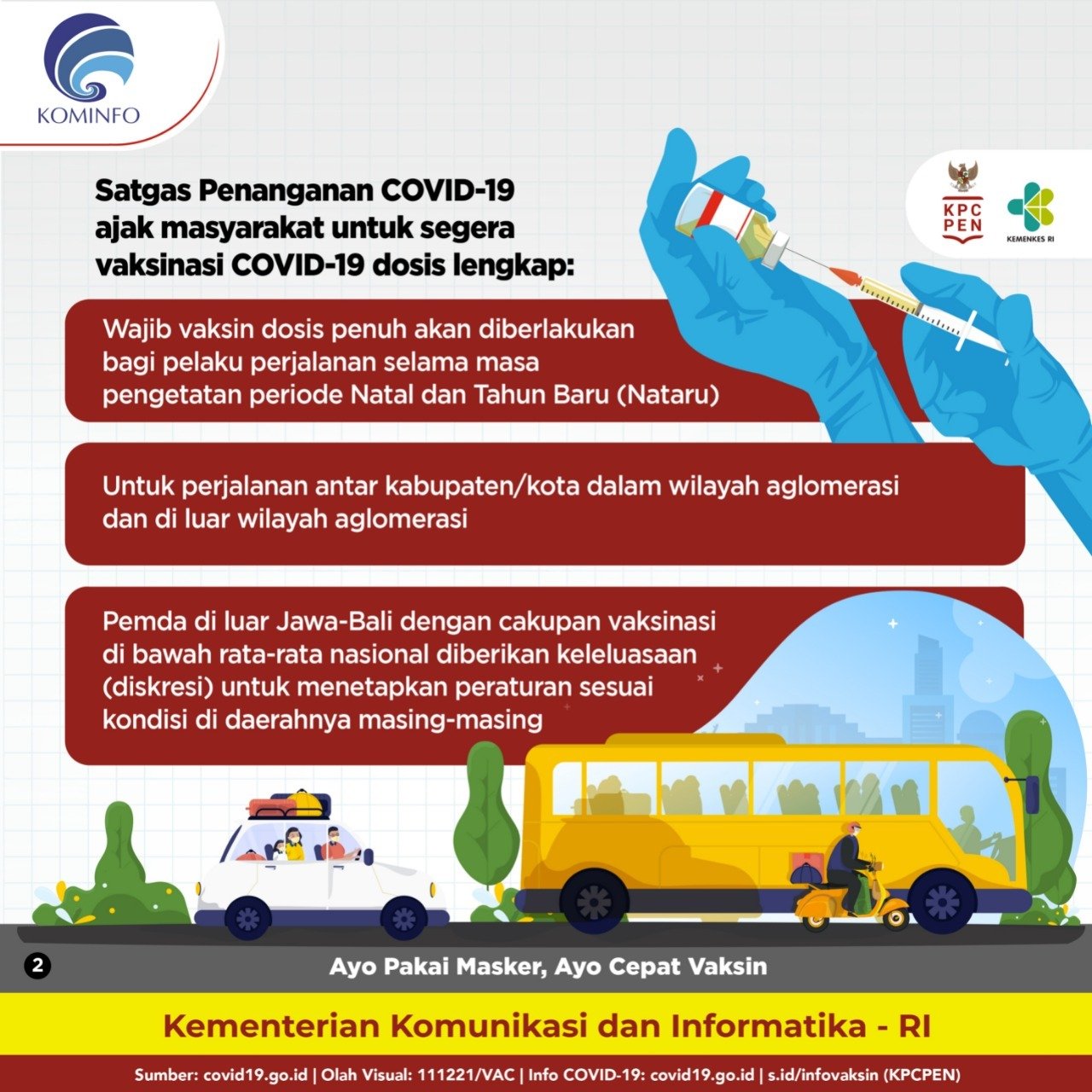 Pasalnya akan segera diberlakukan wajib vaksin dosis penuh bagi pelaku perjalanan selama masa pengetatan periode Natal dan Tahun Baru (Nataru), termasuk untuk perjalanan antar kabupaten/kota dalam wilayah aglomerasi dan di luar wilayah aglomerasi.