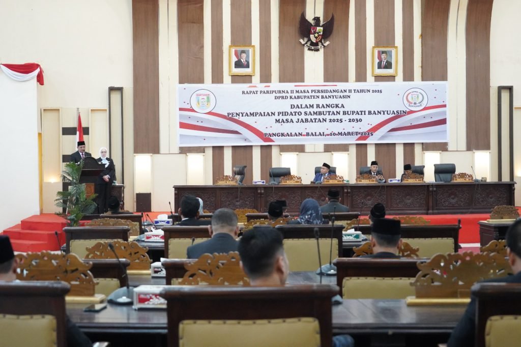 PINGINTAU.ID, BANYUASIN- Bupati Banyuasin Dr. H. Askolani, SH MH didampingi Wakilnya Netta Indian, SP, memaparkan visi misi Banyuasin Bangkit Adil Sejahtera yang Berkelanjutan dalam forum Paripurna II masa persidangan II tahun 2025 di ruang Rapat Paripurna DPRD Kabupaten Banyuasin di Gedung Paripurna DPRD Banyuasin. Senin 10 Maret 2025.