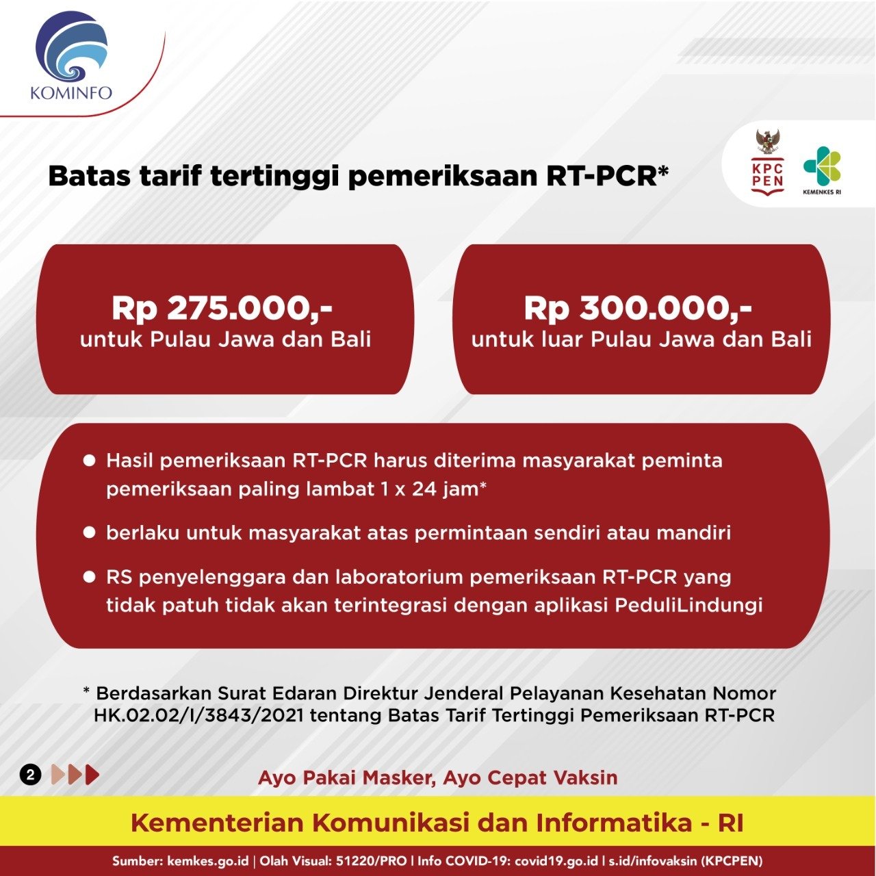 Hal ini sudah diatur melalui Surat Edaran Direktur Jenderal Pelayanan Kesehatan Nomor HK.02.02/I/3843/2021 tentang Batas Tarif Tertinggi Pemeriksaan RT-PCR.