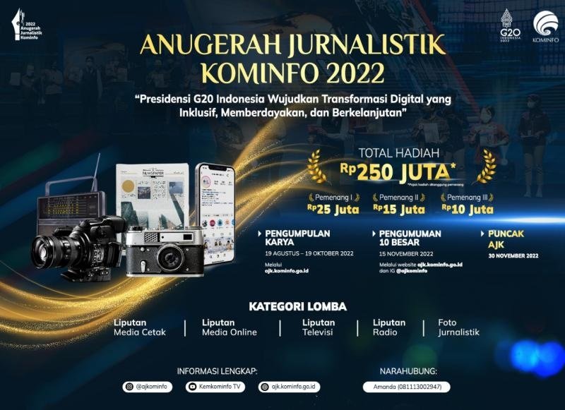 Pingintau.id – Kominfo kembali melaksanakan Kompetisi tahunan Anugerah Jurnalistik Kominfo (AJK) 2022 dan tahun ini dengan mengusung tema “Presidensi G20 Indonesia Wujudkan Transformasi Digital yang Inklusif, Memberdayakan, dan Berkelanjutan”.
