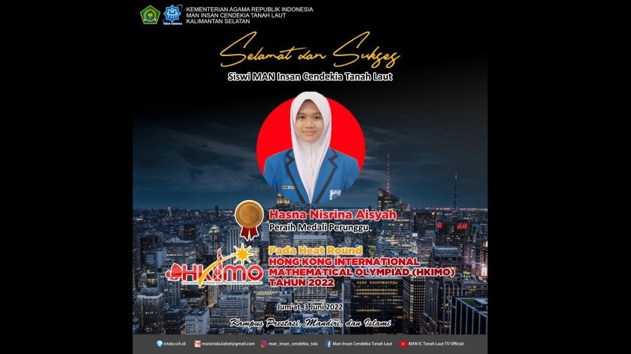 Pingintau.id, Tanah Laut (Kemenag) — Siswi MAN Insan Cendekia Tanah Laut Kalimantan Selatan, Hasna Nisrina Aisyah meraih Medali Perunggu pada Olimpiade Heat Round Hong Kong Internasional Mathematical Olympiad (HKIMO) 2022. HKIMO merupakan Olimpiade Matematika Internasional Hongkong yang bertujuan untuk mempromosikan Olimpiade Matematika ke seluruh dunia.