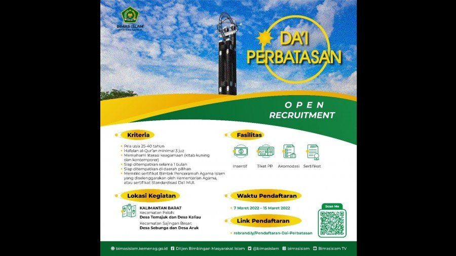 Pingintau.id, Program Da’i Perbatasan tahun 2022 segera bergulir. Kementerian Agama membuka pendaftaran bagi para pendakwah yang akan ditempatkan di wilayah perbatasan Provinsi Kalimantan Barat dengan Malaysia.
