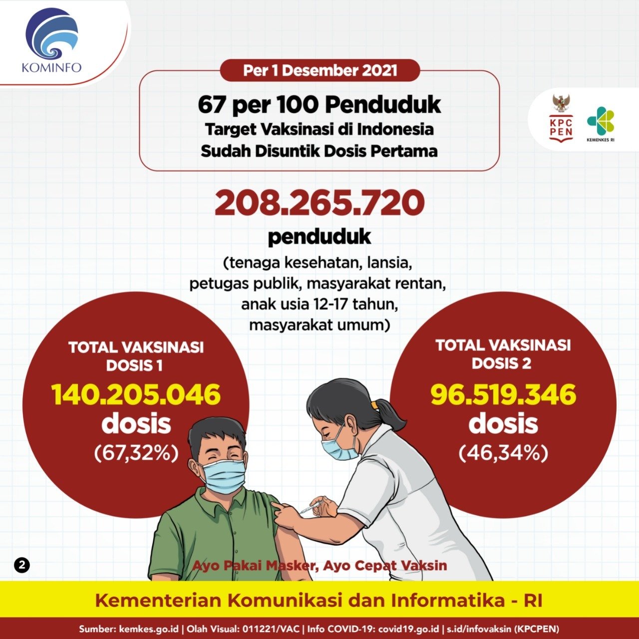Total vaksinasi dosis 1 sudah mencapai 140.205.046 dosis (67,32% dari target) dan vaksinasi dosis 2 sudah mencapai 96.519.346 dosis atau 46,34% dari target.