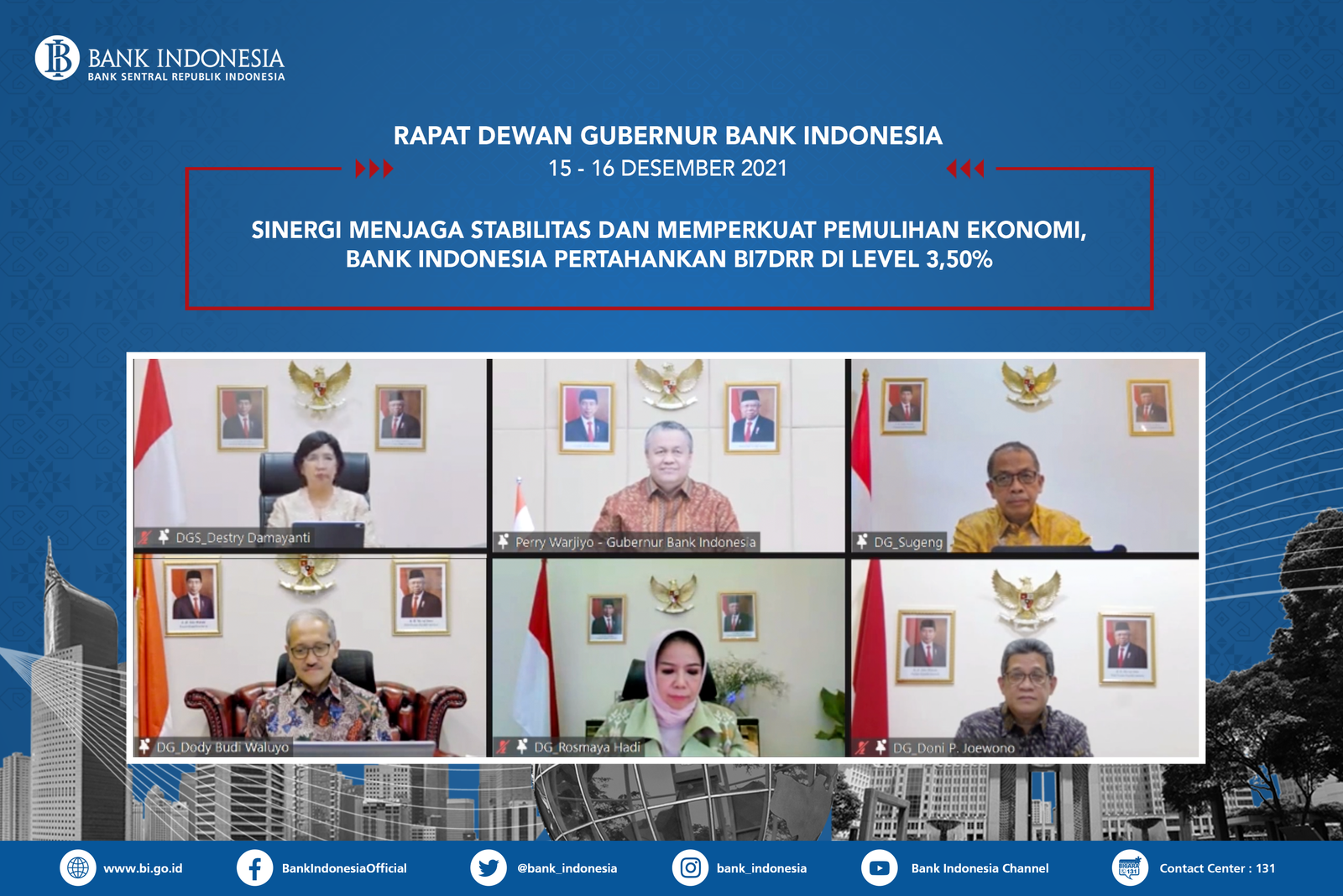 Pingintau.id, Rapat Dewan Gubernur (RDG) Bank Indonesia pada 15-16 Desember 2021 memutuskan untuk mempertahankan BI 7-Day Reverse Repo Rate (BI7DRR) sebesar 3,50%, suku bunga Deposit Facility sebesar 2,75%, dan suku bunga Lending Facility sebesar 4,25%.