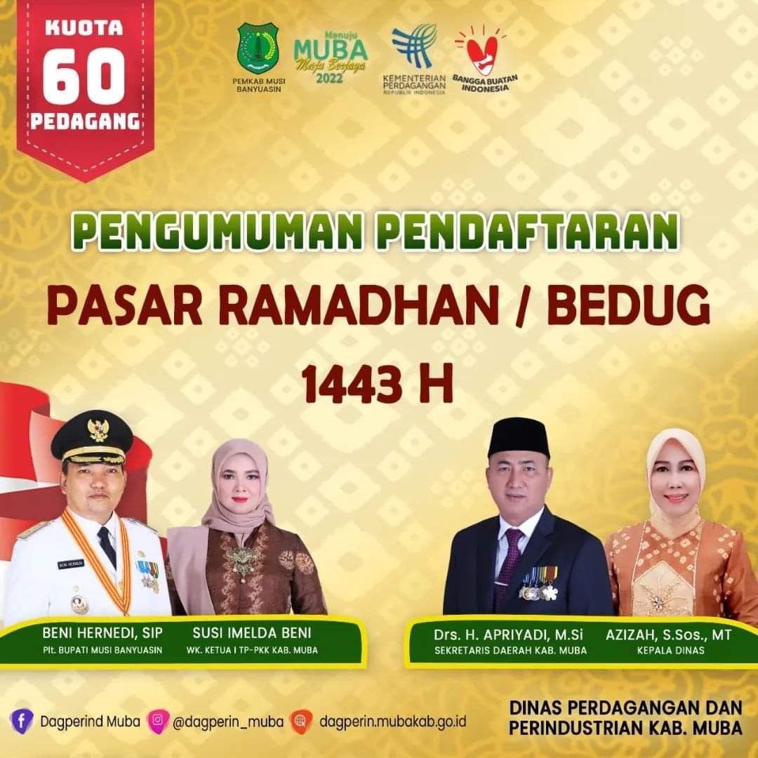 Hal ini juga guna mendukung UMKM di Muba saat bulan puasa agar dapat menjual produk terutama di sektor kuliner. “Pasar bedug nantinya akan dipusatkan di halaman parkir Eks Penjara atau depan Gedung Dharma Wanita Sekayu,” ucap Plt Bupati Beni Hernedi SIP melalui Sekda Muba Drs Apriyadi MSi.