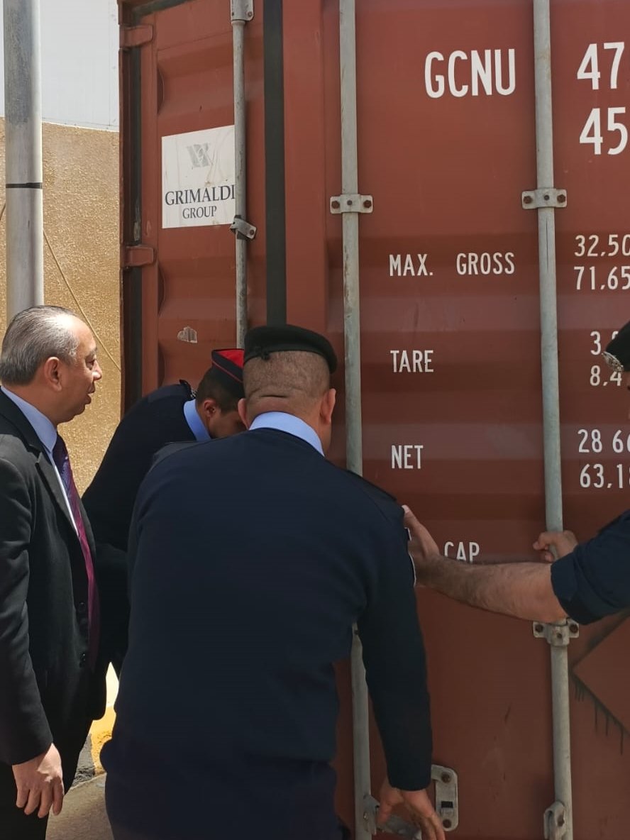 Didampingi Koloner Ing. Jamal Abu Shqaeer, Direktur Maintenance PSD, Dubes Ade Padmo Sarwono melakukan pengguntingan pita dan pembukaan pintu kontainer bertempat di Gudang Logistik PSD di wilayah Al Mwaqqar Propinsi Azraq, 30 Maret 2022.