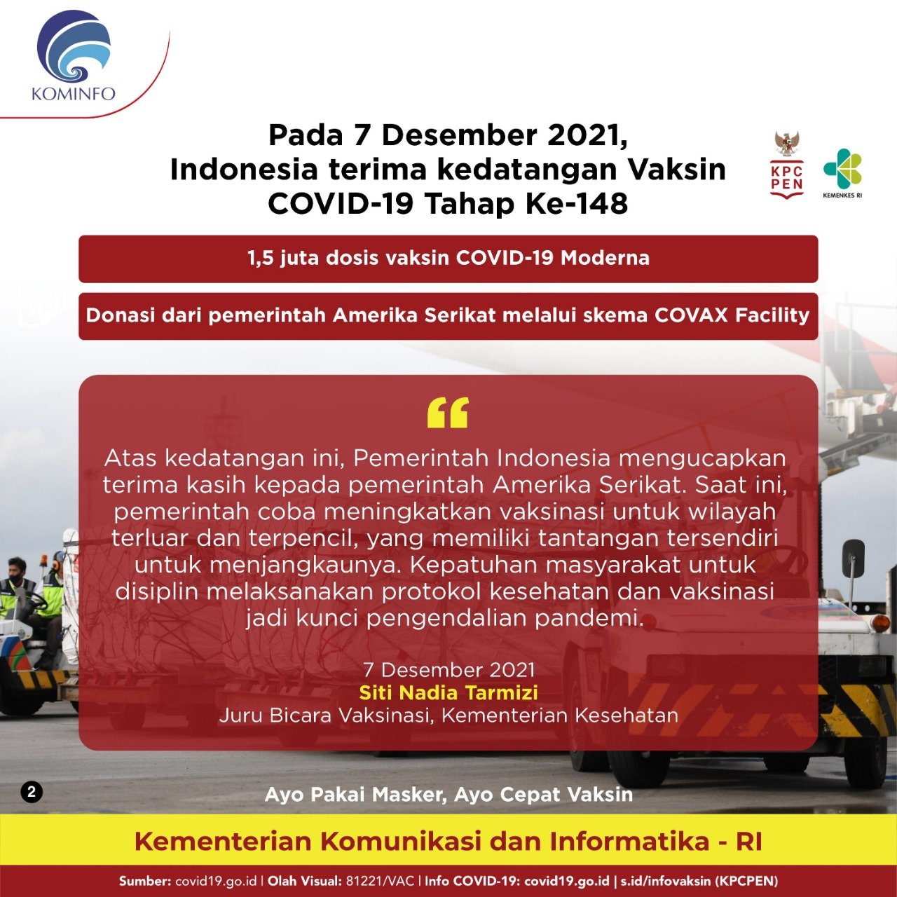 Pingintau.id, Pada 7 Desember 2021, Indonesia menerima kedatangan Vaksin COVID-19 Tahap Ke-148 sebanyak 1,5 juta dosis vaksin COVID-19 Moderna.