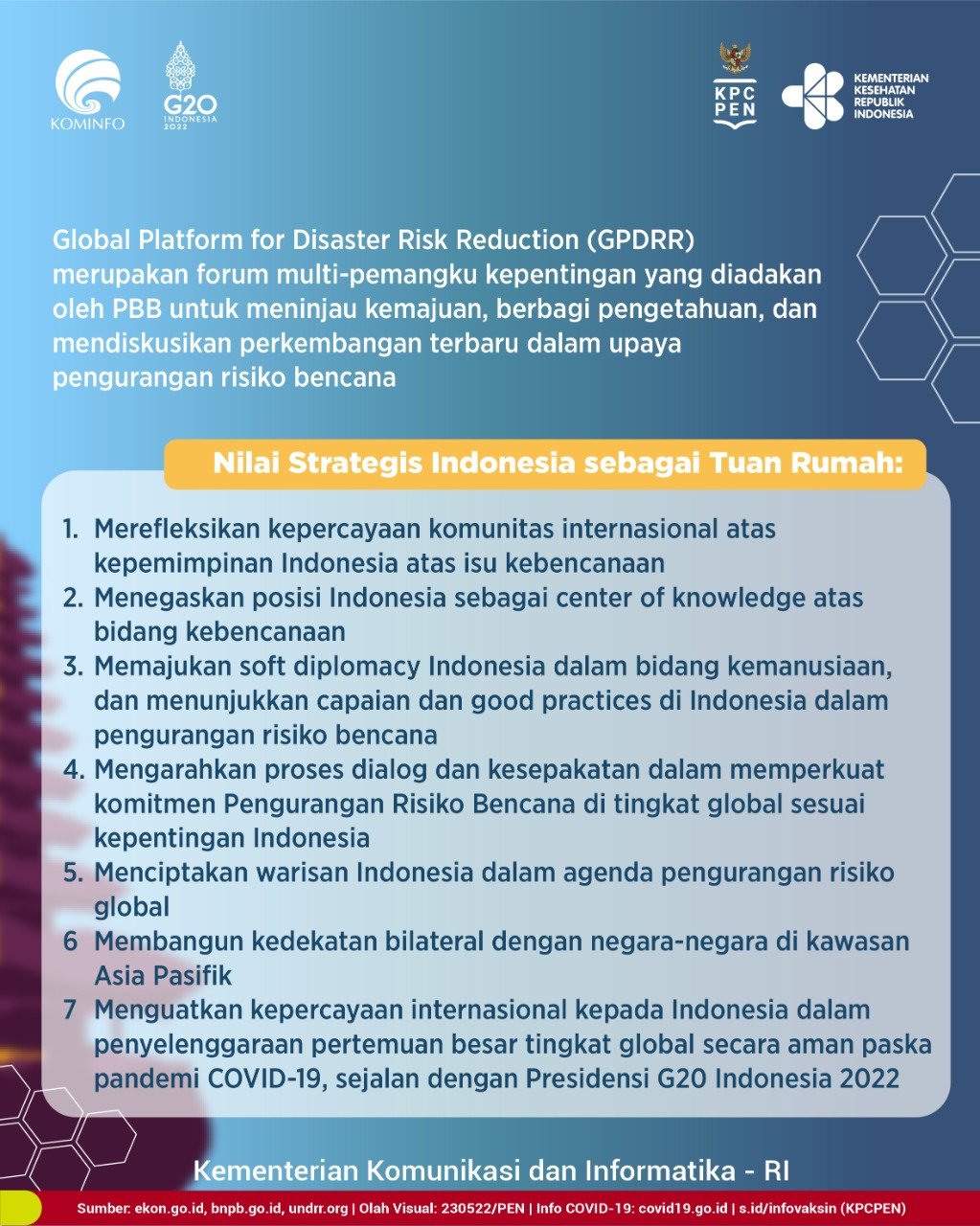 Pingintau.id, Indonesia dipercaya menjadi tuan rumah penyelenggaraan Global Platform for Disaster Risk Reduction (GPDRR) 2022 di Bali untuk berkontribusi dalam menciptakan dunia yang lebih baik melalui pengarusutamaan Pengurangan Risiko Bencana, dari topik tata kelola dan pembiayaan risiko bencana serta pemulihan COVID-19.