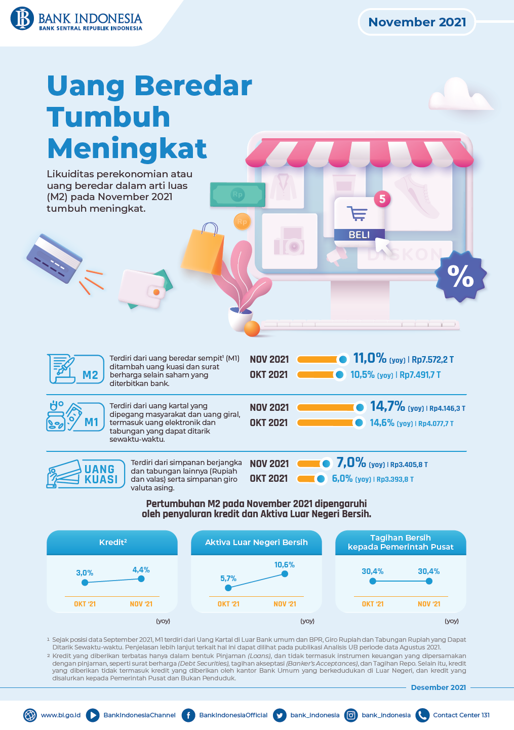 Peningkatan tersebut didorong oleh akselerasi uang beredar dalam arti sempit[1] (M1) sebesar 14,7% (yoy) dan uang kuasi sebesar 7,0% (yoy).