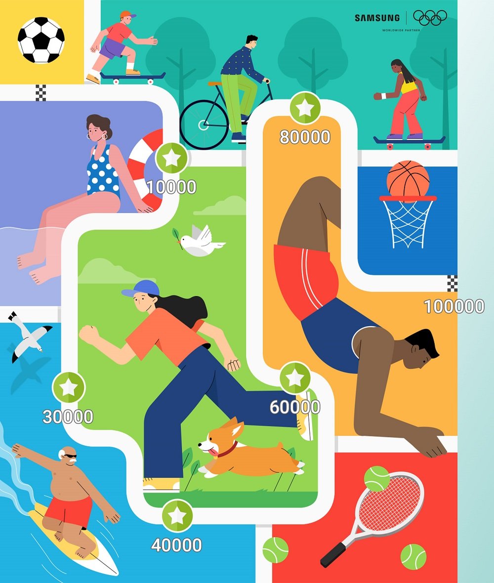 Dengan target keseluruhan 100.000 langkah, pengguna akan didorong oleh pesan ucapan selamat yang muncul dengan setiap pencapaian 20.000 langkah, sementara tab “Bersama” di aplikasi memungkinkan pengguna mengakses “Peta Tantangan” dan memeriksa jumlah langkah mereka secara keseluruhan dan peringkat. Peserta yang berhasil menyelesaikan seluruh tantangan akan diberi hadiah unik “Lencana Hari Olimpiade”, yang akan ditampilkan di bagian “Halaman Saya” di aplikasi Samsung Health.