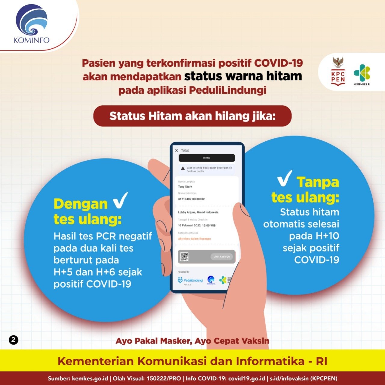 Pingintau.id, Pasien yang terkonfirmasi positif COVID-19 akan mendapatkan status warna hitam pada aplikasi PeduliLindungi.