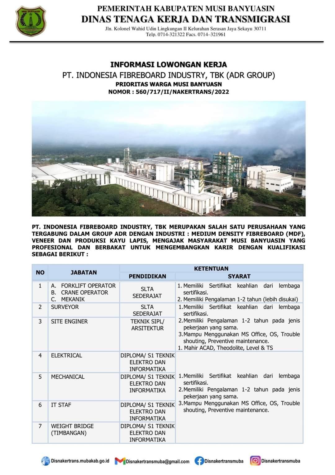 Pingintau.id, Pemerintah Kabupaten Musi Banyuasin melalui Dinas Tenaga Kerja dan Transmigrasi kembali menyampaikan informasi lowongan kerja yang diprioritaskan untuk tenaga kerja lokal.Kali ini PT Fibreboard Industry TBK mengajak masyarakat Muba yang profesional dan berbakat untuk bergabung.